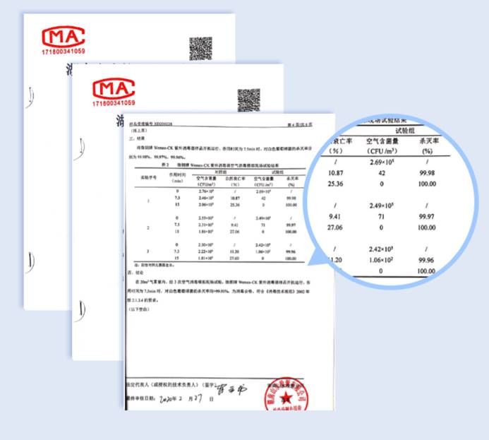 据介绍,微朗科技Wemax-CK1000在2月中旬基本已准备完成,但上线日期一再推迟。原因是Wemax-CK1000作为移动消毒设备送检实验室时,因杀菌率过高导致检测机构一度怀疑检测仪器失灵,在多轮重复测试确定杀菌率真实并有效后,才最终下发了检测结果。根据检测机构经验,普通紫外线消毒器杀菌率达到95%以上已经是较少情况,而微朗科技Wemax-CK1000在1000W微波的加持下,高质量通过了多次试验,杀菌率大于99.99%,甚至接近100%。