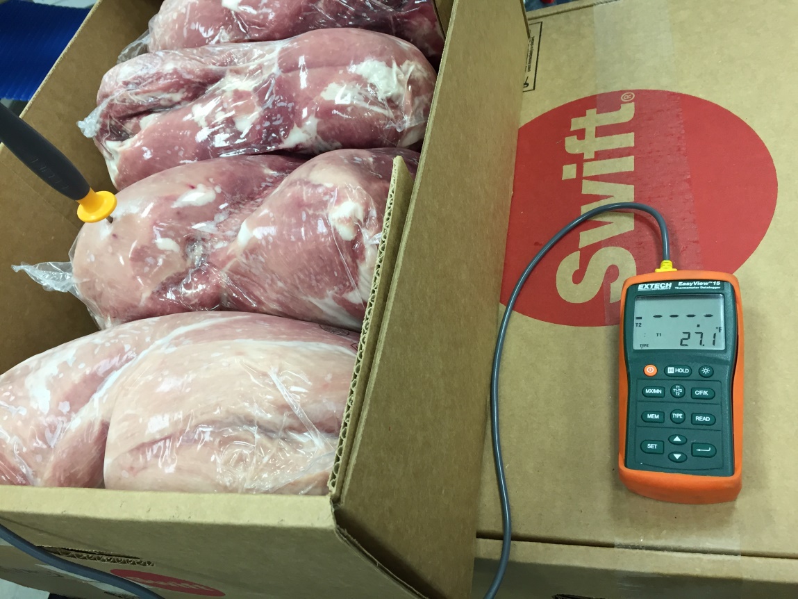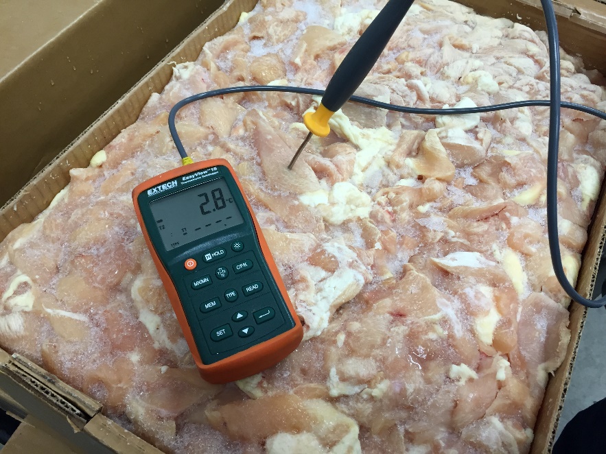 下图是2015年微朗科技带国内某肉联厂董事长,在美国进行各种肉制品进行解冻得到的现场试验效果:(解冻到-2℃,温度均匀,无血水产生,图1显示为华氏摄氏度)